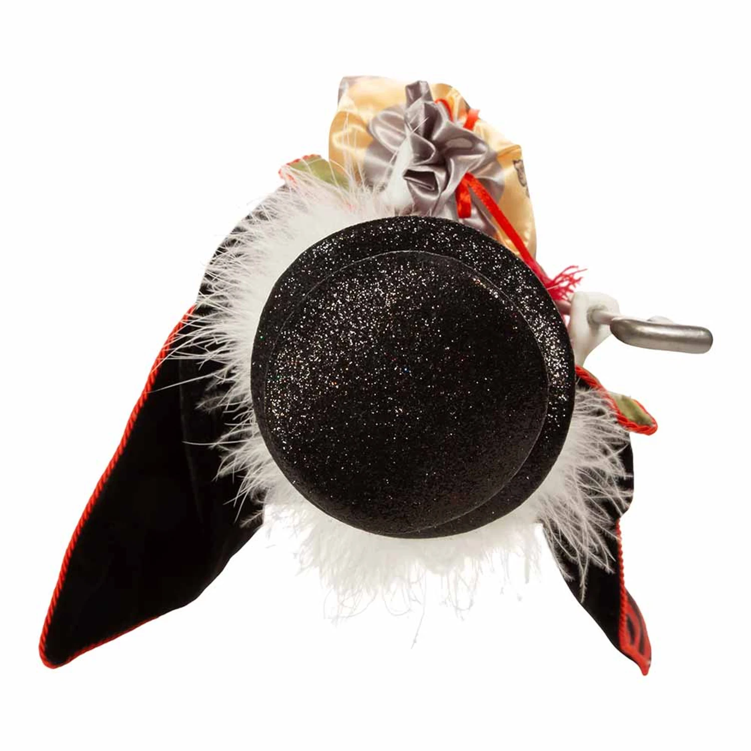 Everyone knows the iconic Ebenezer Scrooge and his greed. This nutcracker features the old man with blushing cheeks and large brown eyes peering out of round wired rimmed glasses. His fluffy white hair pokes out in different directions from underneath a large black glittered top hat. Underneath a black velvet cape pokes out a pair of white gloved hands holding a cane and a bag that reads “Scrooge” with the “S” as a money sign. A pair of checkered pants are neatly tucked into a pair of fancy laced boots and a few stray coins lay at his feet. Made by Kurt Adler. Made of wood. Dimensions: 17″ tall. Item #: HA0615