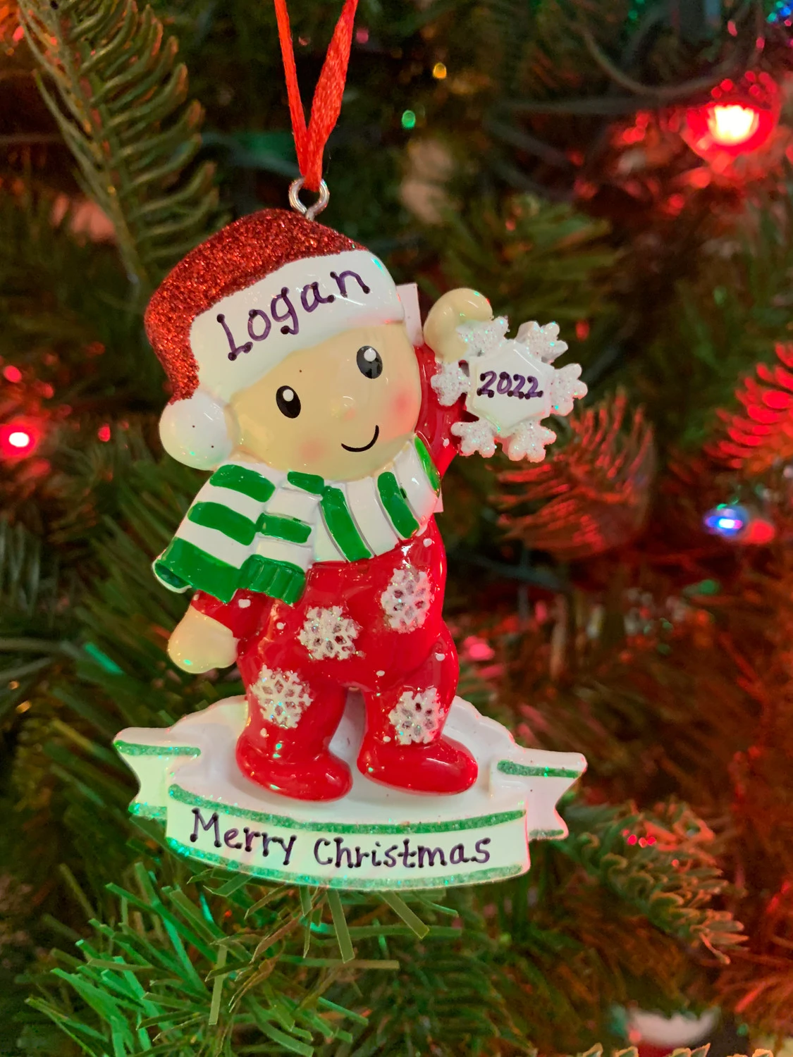 It’s Christmas Eve, time for bed! This little one is in red pajamas with with snowflakes, a green and white white striped scarf, and a red glittered hat. Put your child’s name and the date for a cute keepsake! Made of resin. Dimensions: 2.5″ x 3.5″. Item #: OR1920-RG
