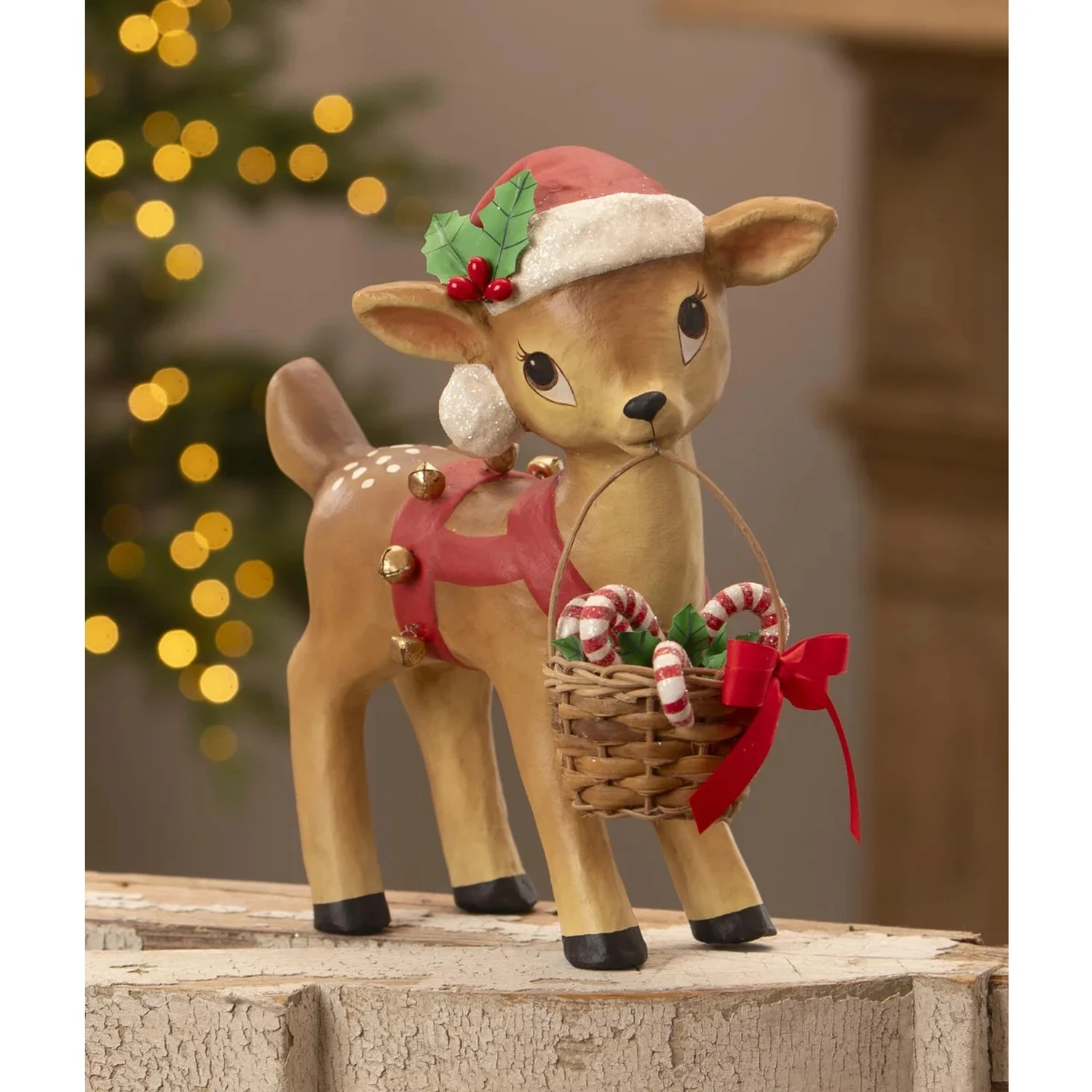 This charming tan deer figure has small white spots on her hind legs with a red harness dotted with gold bells and a red Santa hat! In her mouth is a dangling basket filled with holly leaves and striped candy canes with a red ribbon! This decoration is perfect for your tabletop or entry way this Christmas season. Made by Bethany Lowe. Made of Hand-painted paper mache, basket, faux greenery, resin candy canes, bells, and glitter. Dimensions: 10.25″ X 3.75″ X 10.75″. Item #: TJ3319Â