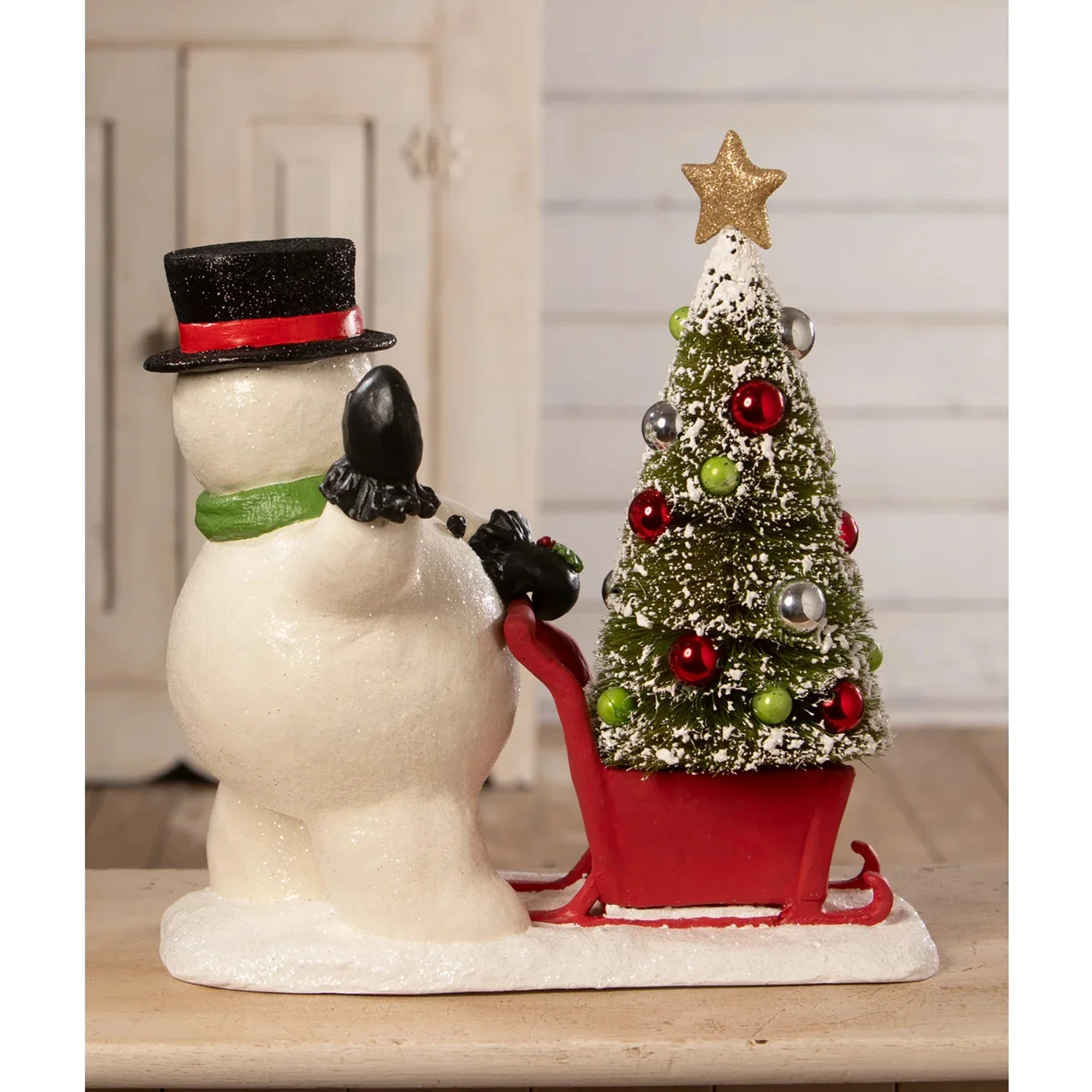 This large snowman pulling sled figure is out and about this holiday and makes his way back home with a bright red sled and brand new, fresh Christmas tree decorated with flocking, colorful ornaments, and a gold glittering star! He wears a top hat and green scarf as he pushes the sled with black mittens! This snowman figure would make the perfect Christmas decoration for your entry way greeting all your guests. Made by Bethany Lowe. Made of Hand-painted resin, bottle brush, beads, and glitter. Dimensions: 13.5″ X 6″ X 14.5″. Item #: TD3173