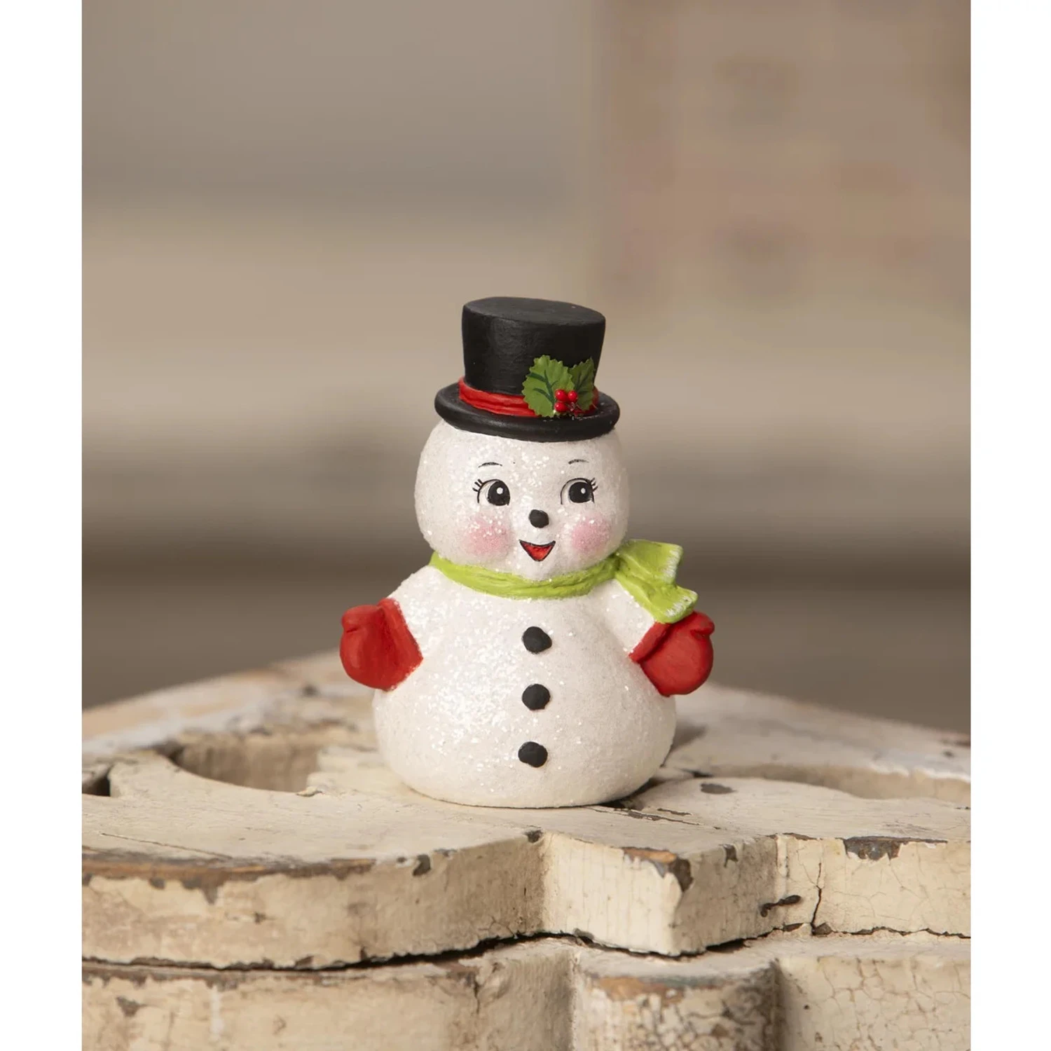 This retro snowman figure has sweet blushing cheeks and a black top hat with a red stripe and holly! He wears a green scarf around his neck and a set of red mittens with a light dusting of snowy glitter! This snowman figure would make the perfect addition to you Christmas home decor this holiday season. Made by Bethany Lowe. Made of Hand-painted resin, and glitter. Dimensions: 3.25″ X 2.75″ X 4.5″. Item #: TF3266