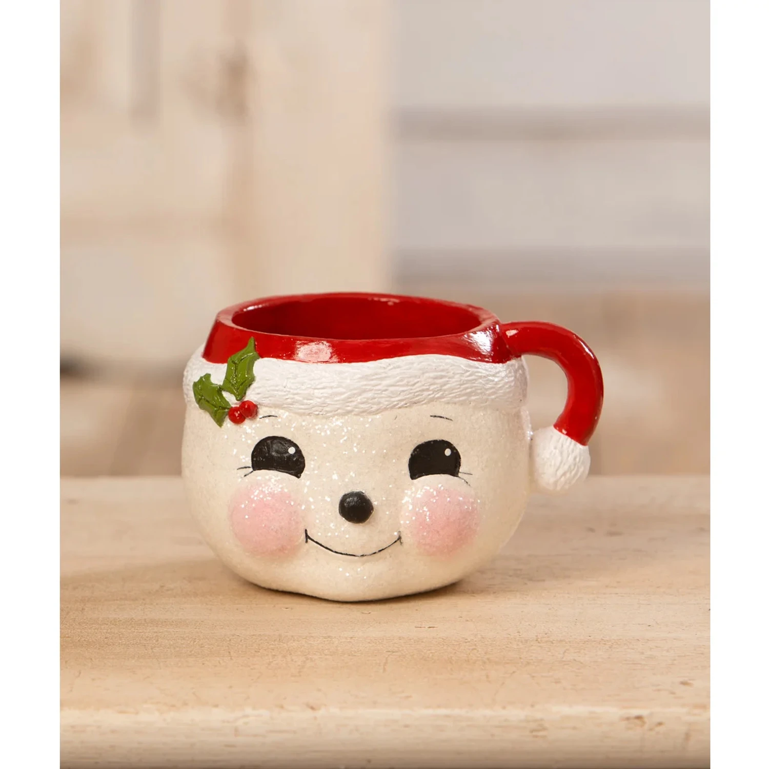 It’s a peppermint party in here! This Christmas mug features an adorable snowman face with deep black eyes and light pink cheeks! The red hat on his head makes the handle of the mug! This mug would be perfect to add a matching bottle brush tree! Not food safe. Made by Bethany Lowe. Made of Hand-painted resin and glitter. Dimensions: 5.25″ X 4.25″ X 3.75″. Item #: TF3274