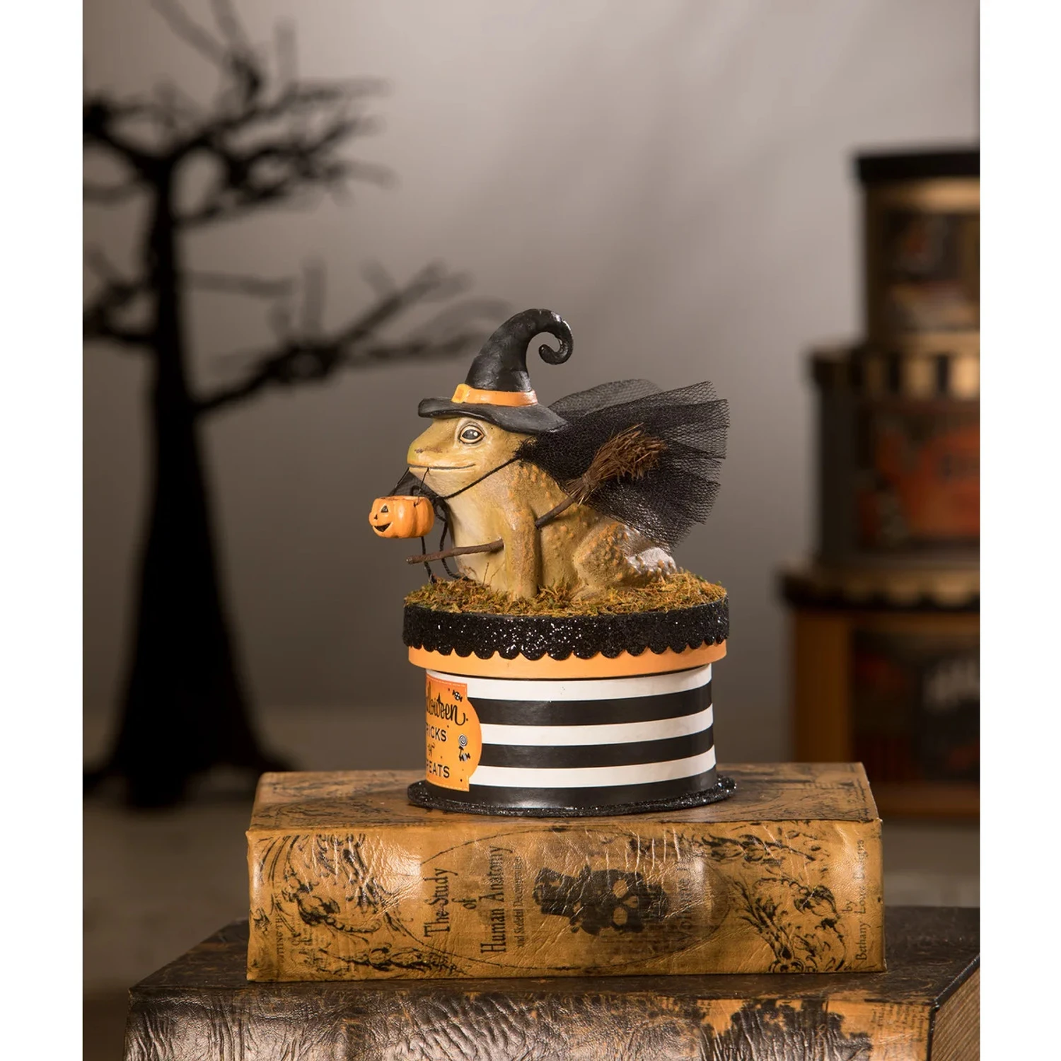 Add a whimsical touch to your Halloween décor with the Bethany Lowe 7″ Witchy Toad On Box Container! This charming little toad is all dressed up for spooky season in a tall pointed witch hat with a tulle veil, holding a candy pail in her mouth and a tiny straw broom tucked under her arm. She stands atop a grassy, moss-covered patch that doubles as the lid to a black-and-white striped box, complete with a vintage-style label on the front. A playful and functional piece, perfect for storing treats or small trinkets! Made by Bethany Lowe. Made of Hand-painted resin, paper, fabric. Dimensions: 4.5″ X 4.5″ X 7″. Item #: TL2348Â