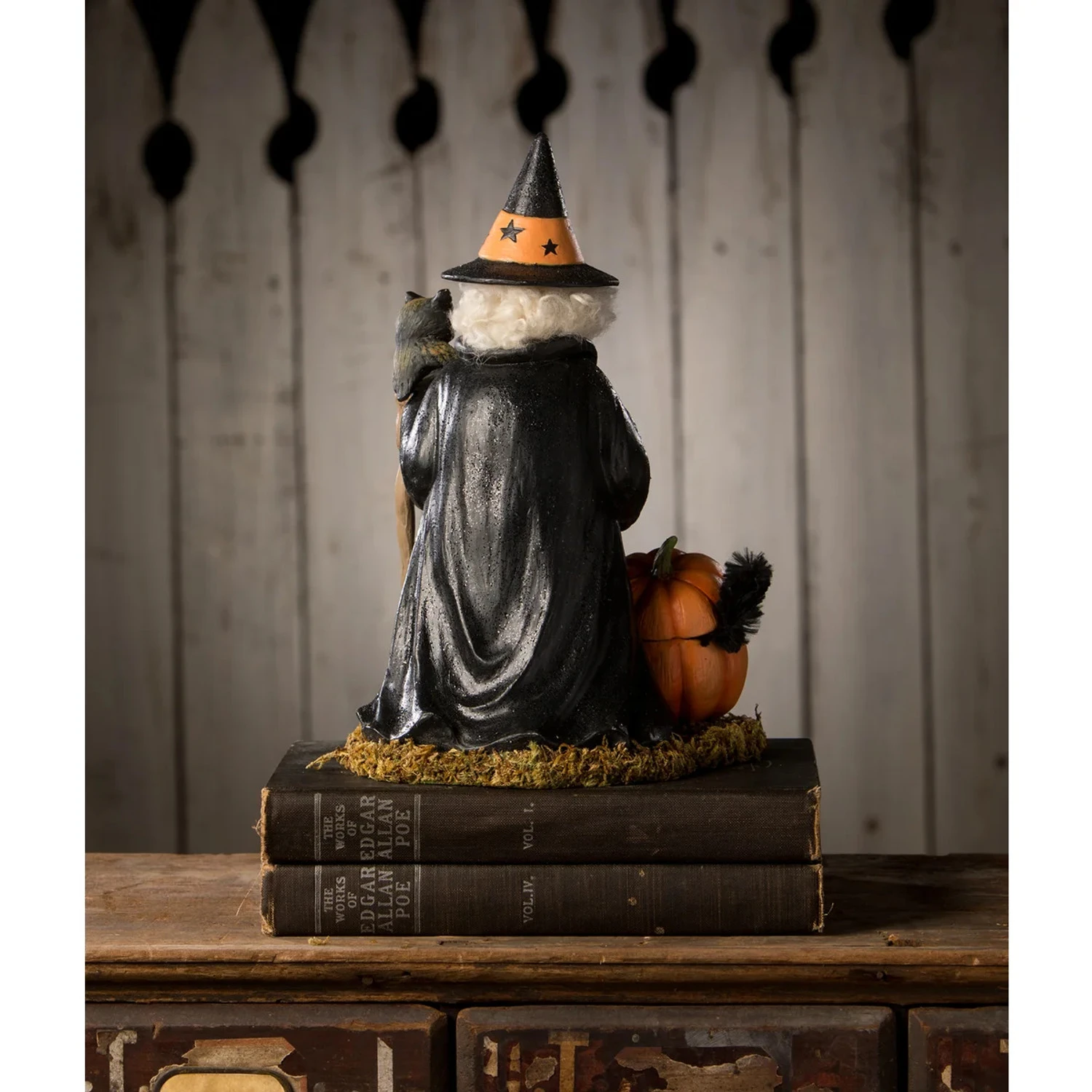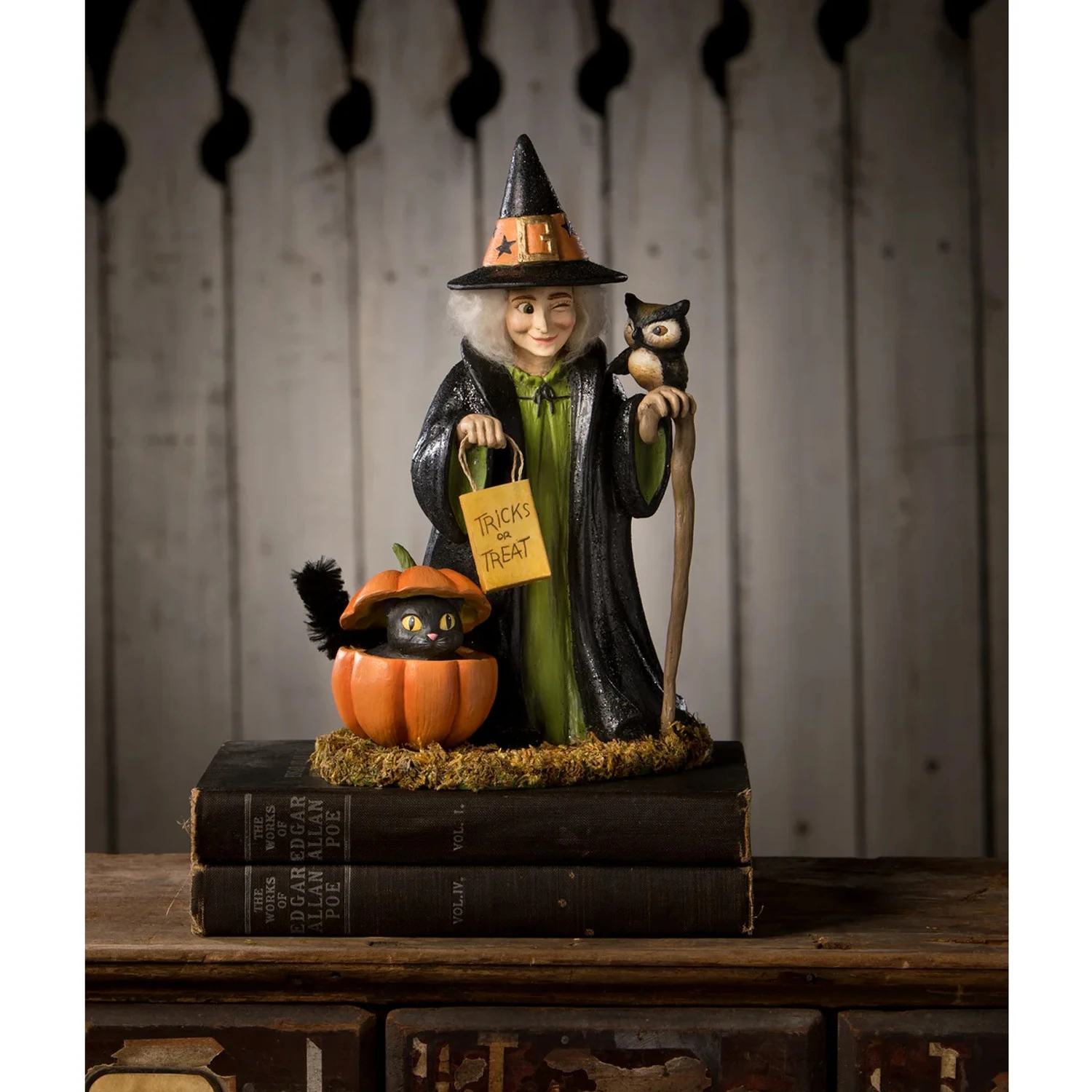 Is she a witch pretending to be a trick or treater…or a trick or treater dressed as a witch? This Callie Halloween figure has pale green skin and gives a wink with fluffy white hair and a tall black witch’s hat! her green dress is covered by a black cloak and holds a trick or treat bag in one hand and a cane in the other win her arm. At her feet, a bright orange pumpkin with a black cat pops out! Made by Bethany Lowe. Made of Hand-painted resin, natural moss, glitter, chenille, and fabric. Dimensions: 6.75″ X 5.5″ X 9.25″. Item #: TD3151