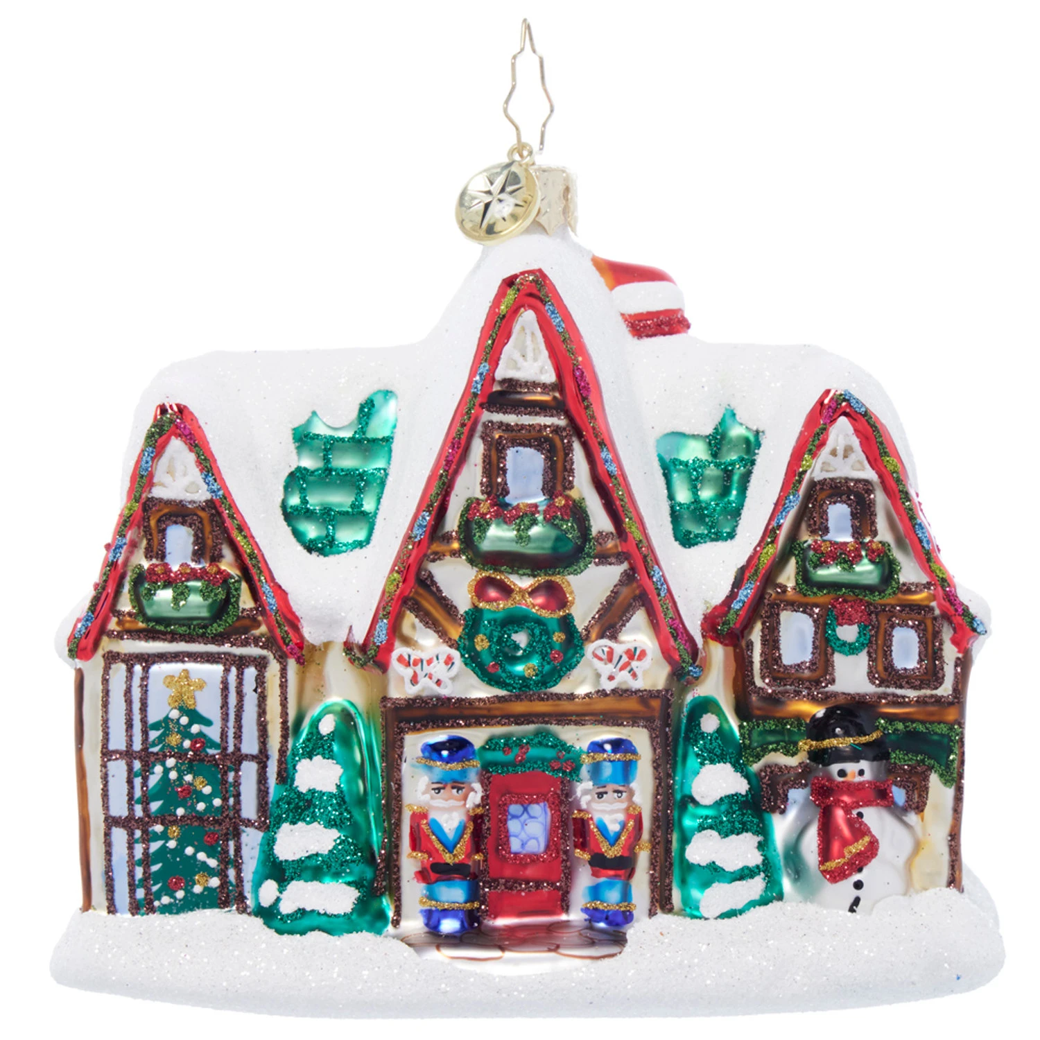 The first ornament shows Santa sitting down in a tall chair to read a Christmas story. Then a snow covered home decorated for the holidays with everyone fast asleep to wait for Santa as their stockings are hung up and ready. A gingerbread wreath for cookies laid out for the jolly old elf as he lands atop the home on his way through the wintery night to leave gifts under gorgeous trees for good little boys and girls. This would make a wonderful gift for a loved one or yourself to start or add to your Christopher Radko collection!Â