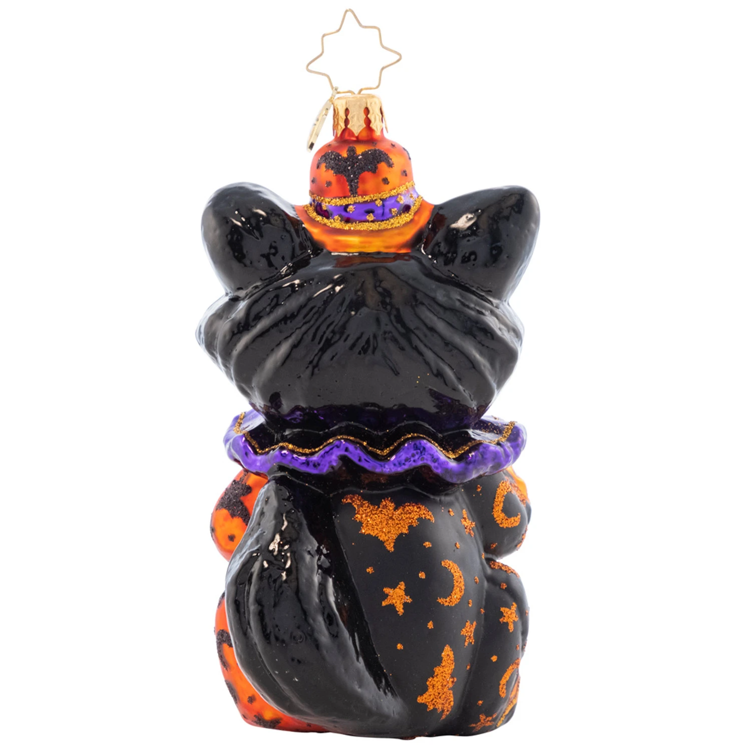 This cutie trick-or-treater is ready for some goodies! A smiling black cat with sharp teeth and a purple mask holds a jack-o-lantern candy pail filled with colorful candy wearing a festive orange and black clown outfit dotted with glitter stars, moons, bats, and dots topped with a party hat! Made by Christopher Radko. Made of glass. Dimensions: 5 in (H) x 3 in (L) x 2.75 in (W). Item #: 1021605