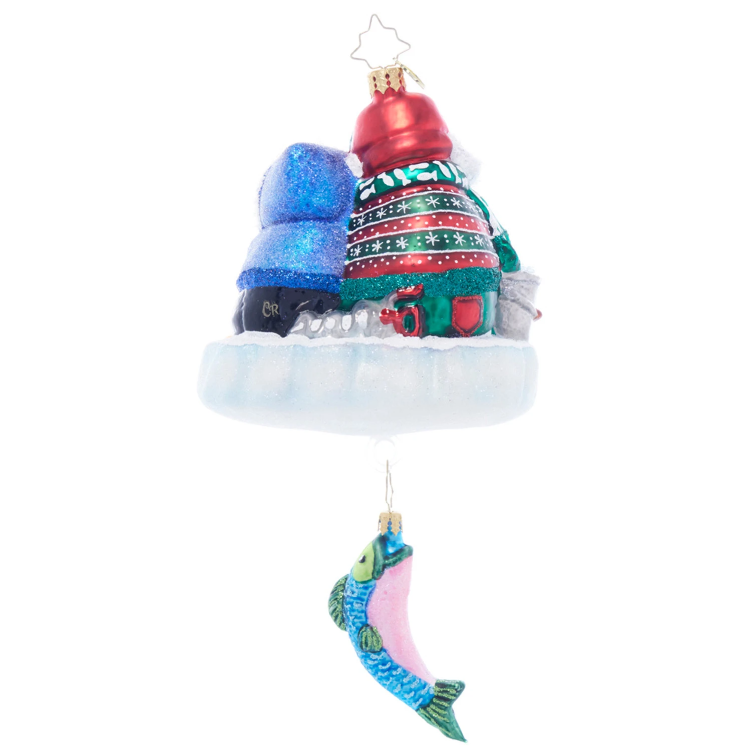 Keep it cool as ice this holiday with this frosty couple! It features a pair of penguins huddling together in warm clothing as they dangling fishing rods through a hole in the glittering ice as a colorful fishing dangles below them! This would make a lovely gift for anyone who loves fishing! Made by Christopher Radko. Made of glass. Dimensions: 7.5 in (H) x 4.25 in (L) x 3.5 in (W). Item #: 1021927