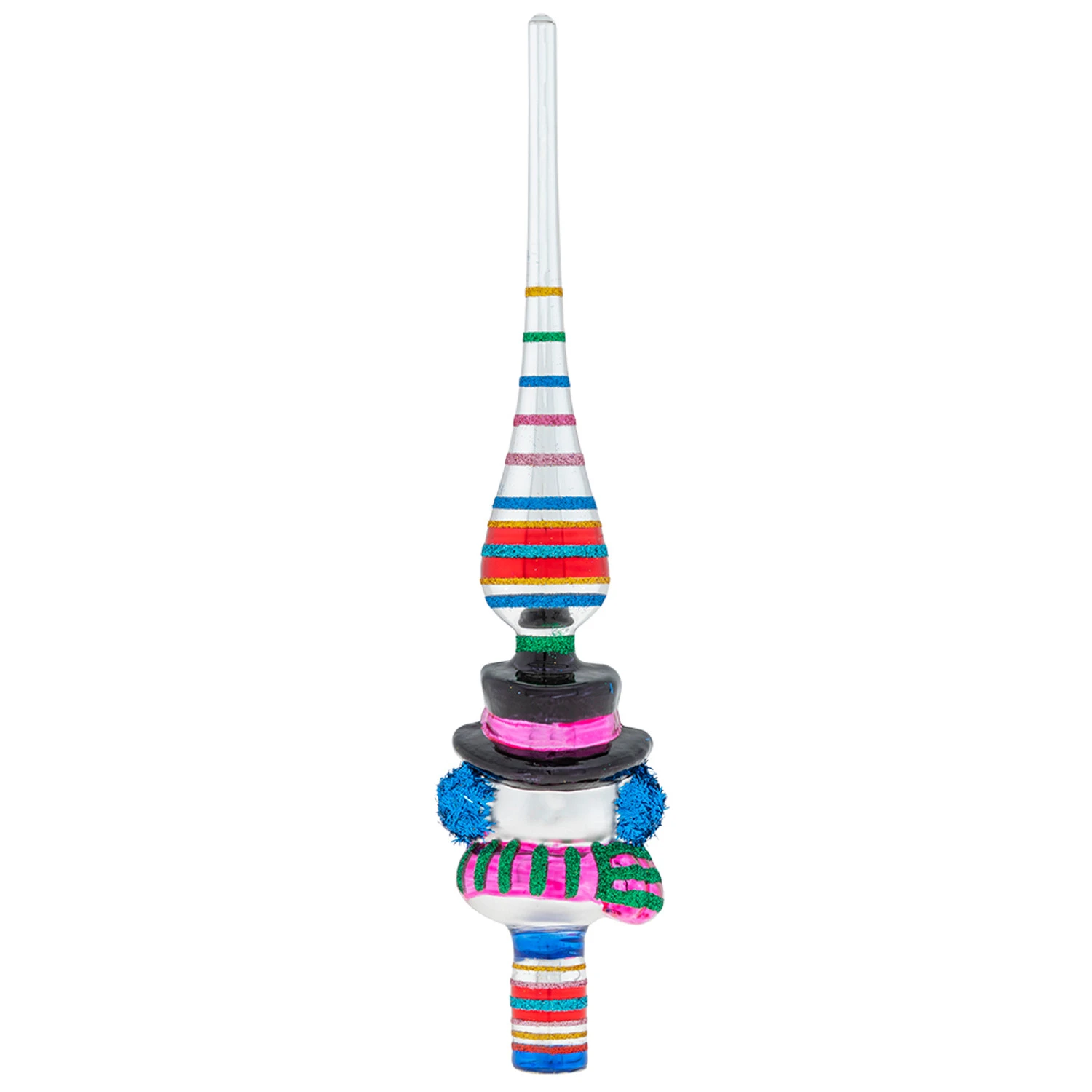 Add some adorable charm to your tree with this stunning Christmas tree topper! It features a glass finial shape with colorful glitter stripes and a snowman face wrapped in a pink and green scarf and deep blue glittered earmuffs! Shiny Brite made by Christopher Radko. Made of glass. Dimensions: 11.5″ tall. Item #: 4028020