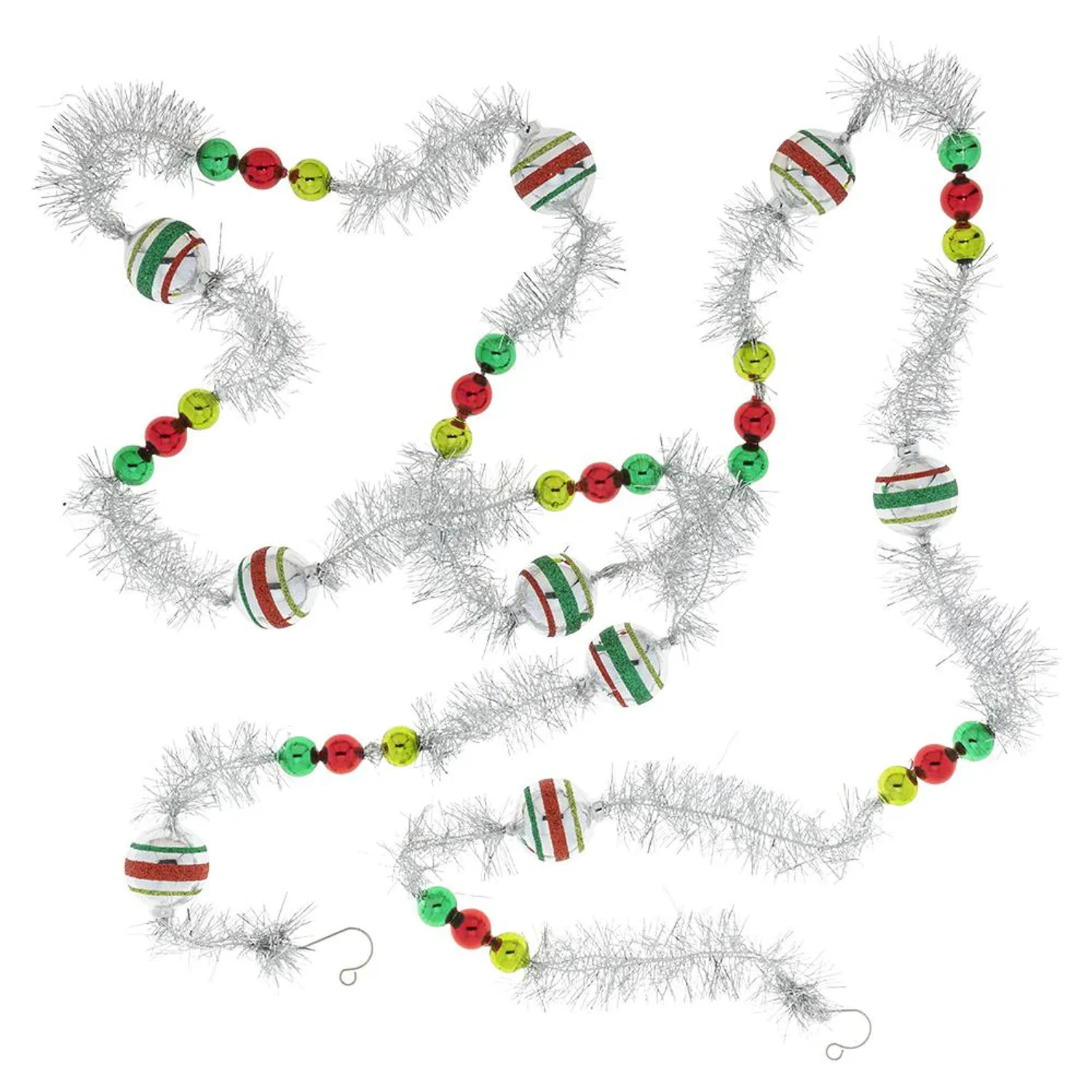 We love vintage Christmas decor! This garland features a silver tinsel garland strand that is dotted with red and green glass beads and larger silver beads with green and red stripes! Perfect to add to your Christmas tree or garland this holiday season. Shiny Brite made by Christopher Radko. Made of glass. Dimensions: 7′ long. Item #: 4027996