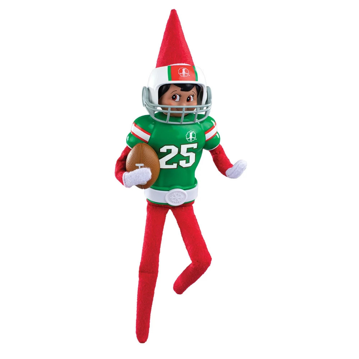 Set…HIKE! Does your scout elf love sports?? They need this awesome football gear set! The set includes a green jersey muscle shirt which matches the white helmet, and a mini football for your elf! Elf not included. Made by Elf On The Shelf. Item #: CCFOOTBALL