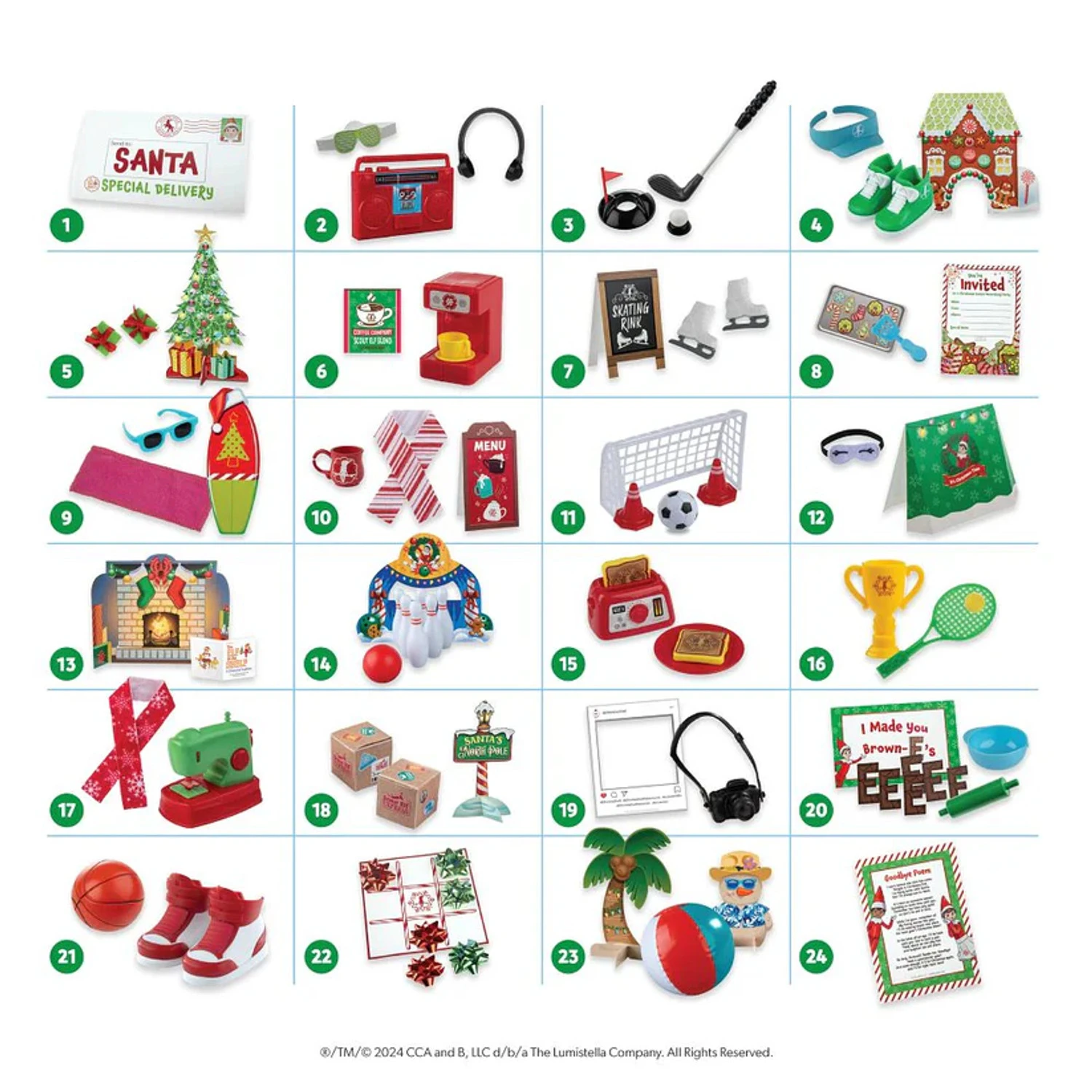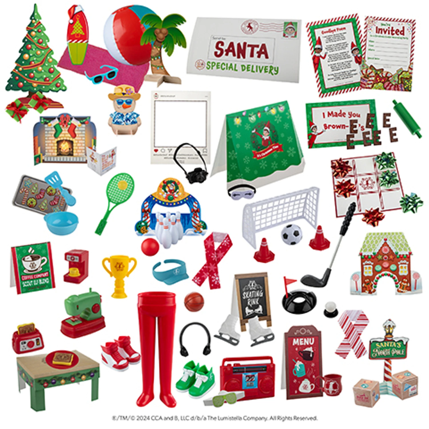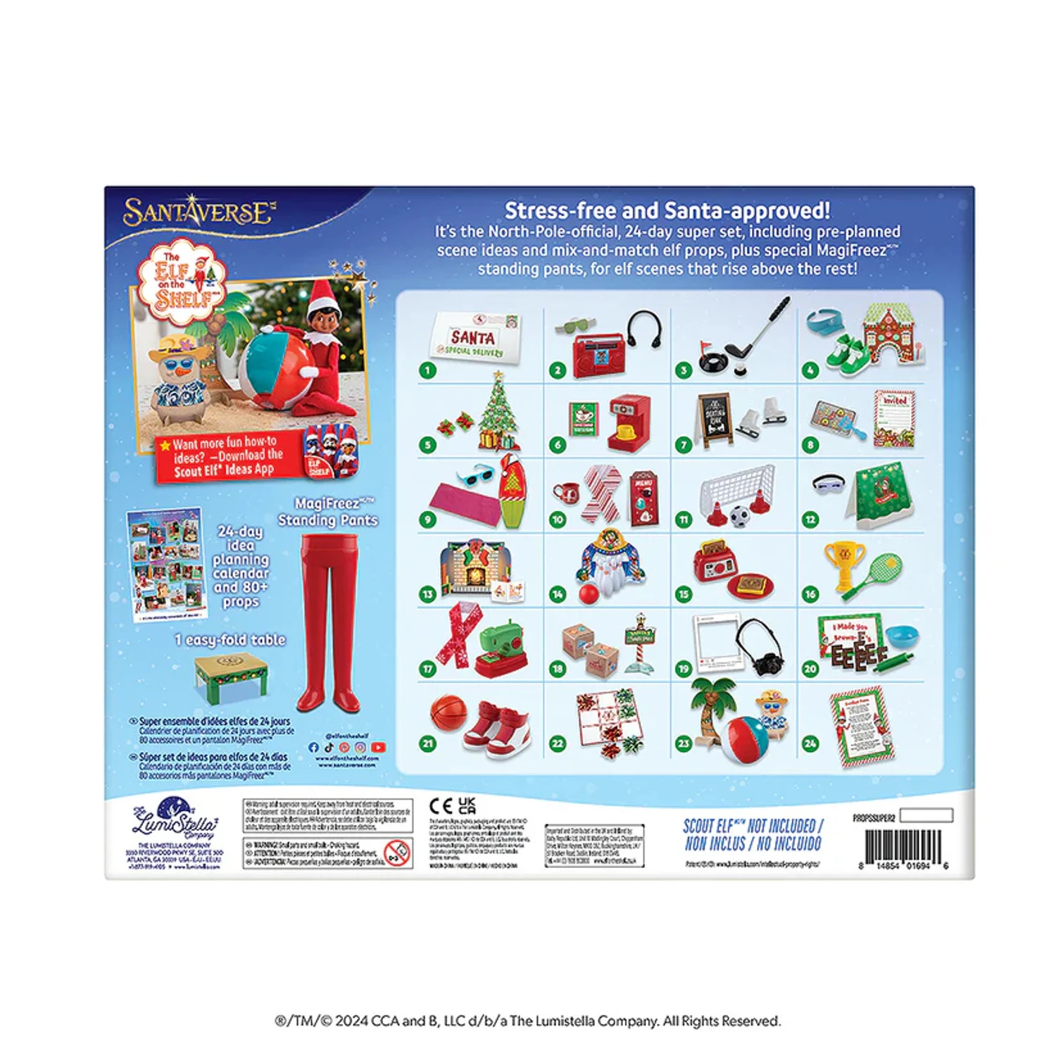 Keep your Scout Elf and your littles busy every single day of the holiday month with this mega set of 24 ideas complete with props! Your Scout Elf will easily stand up with the MagiFreez pants and have a table to work from with an easy-fold craft table! Keep track of your Elf’s new hobbies with the 24 day planning calendar! Your elf can hit the beach, take up sewing, play some soccer, drop off some Christmas gifts, or MORE!  (Elf is not included in this set) Made by Elf On The Shelf. Item #: PROPSSUPER2