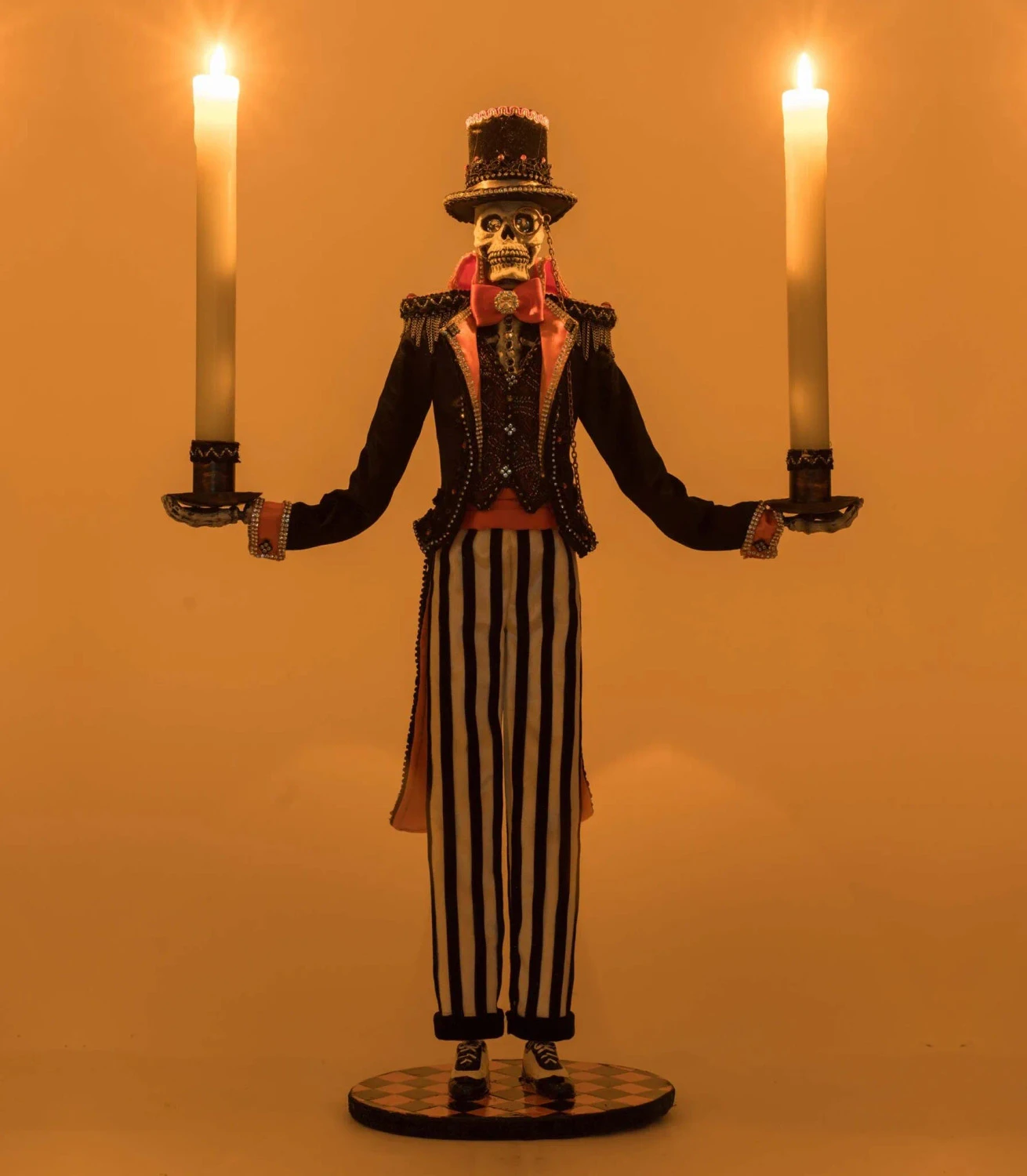 Cast a haunting glow over your Halloween display with this striking Macabre Skeleton Candelabra from Katherine’s Collection! This eerie figure stands tall in striped trousers and a dramatic long petticoat, complete with bright orange lapels, metal chains, and sparkling jewel accents for an extra touch of ghoulish glamour. With both bony arms extended, the skeleton holds taper candle holders at each side—perfect for adding a flickering, flameless light to your haunted home. Whether placed on a mantle, entryway, or dining table, this chilling candelabra makes a bold and stylish statement. A must-have for those who love their Halloween decor a little bit spooky and a whole lot sophisticated. Candles included. Batteries not included. Made by Katherine’s Collection. Dimensions: 14.5 × 5 × 22.5 in. Item #: 28-528667