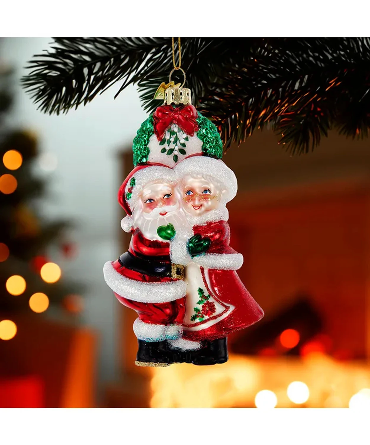Celebrate the season of love with this heartwarming Noble Gems ornament from Kurt Adler! Featuring Santa and Mrs. Claus sharing a sweet embrace beneath a festive green wreath and a sprig of mistletoe, this glass ornament captures the magic of holiday romance. Dressed in their classic bright red outfits with glittering accents, this jolly couple adds a joyful and sentimental touch to any Christmas tree. Made by Kurt Adler. Made of glass. Dimensions: 5″. Item #: NB1787Â