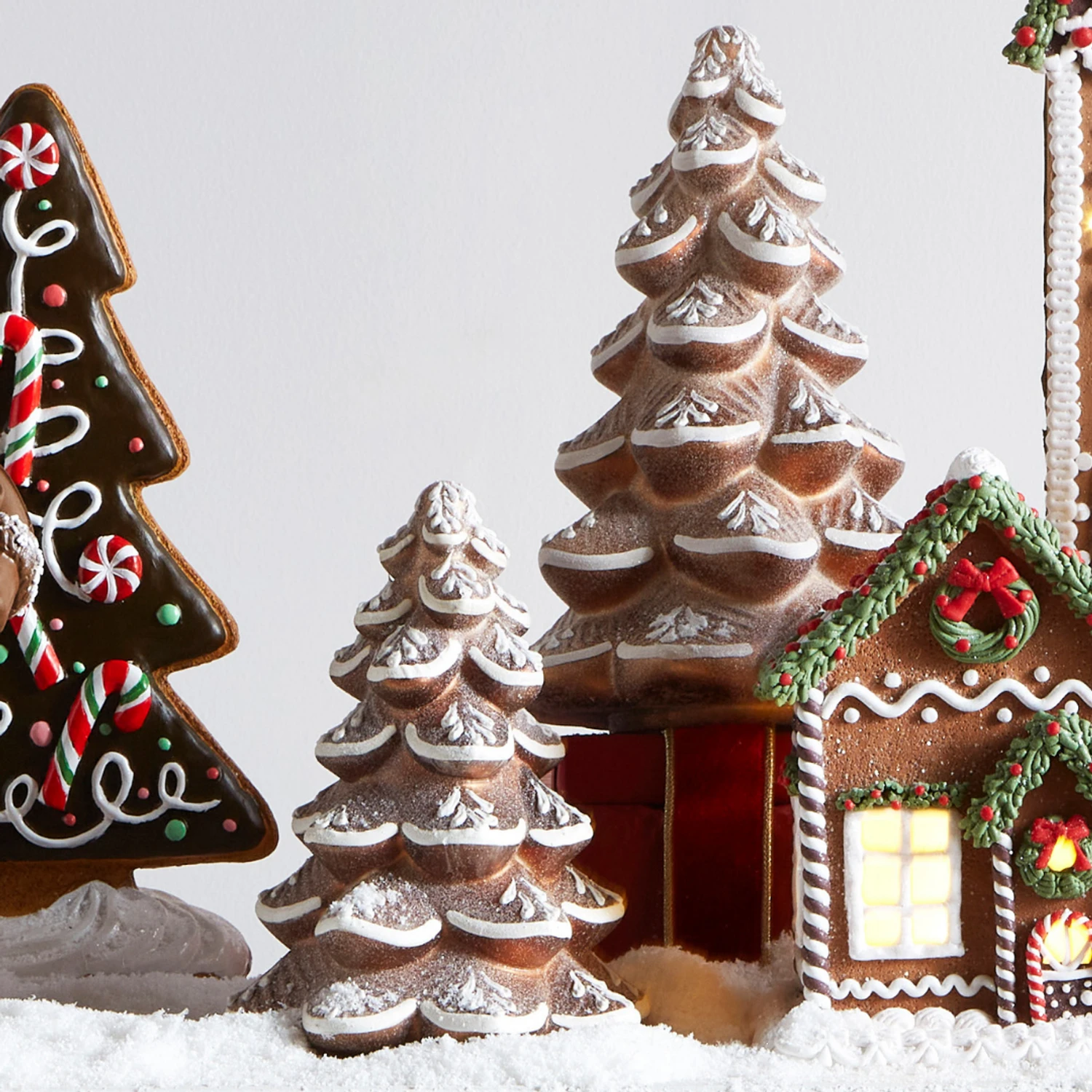 A gingerbread village just isn’t complete without a gingerbread forest! This set of gorgeous trees features light brown glass trees dusted with a thin coating of white glitter and white icing accents on each of the branches! Sold as a set of 2. Made by Raz Imports. Made of glass. Dimensions: 7.5″D X 10.5″H; 6.25″D X 8″H. Item #: 4520870