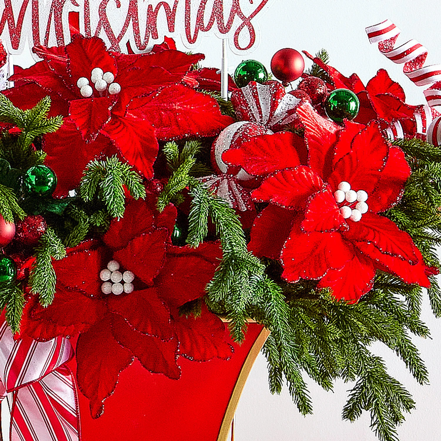 Add a bold touch of holiday elegance to your tree with this 22″ red velvet poinsettia stem from Raz Imports. The vibrant red petals are accented with sparkling dark red glitter and feature a detailed center of clustered seeds for added texture. Perfect for tucking into your Christmas tree, wreaths, or garlands, this bloom brings rich color and classic charm to any festive display. Made by Raz Imports. Made of polyester, paper, and foam. Dimensions: 22″, 2″ bloom. Item #: F4531000
