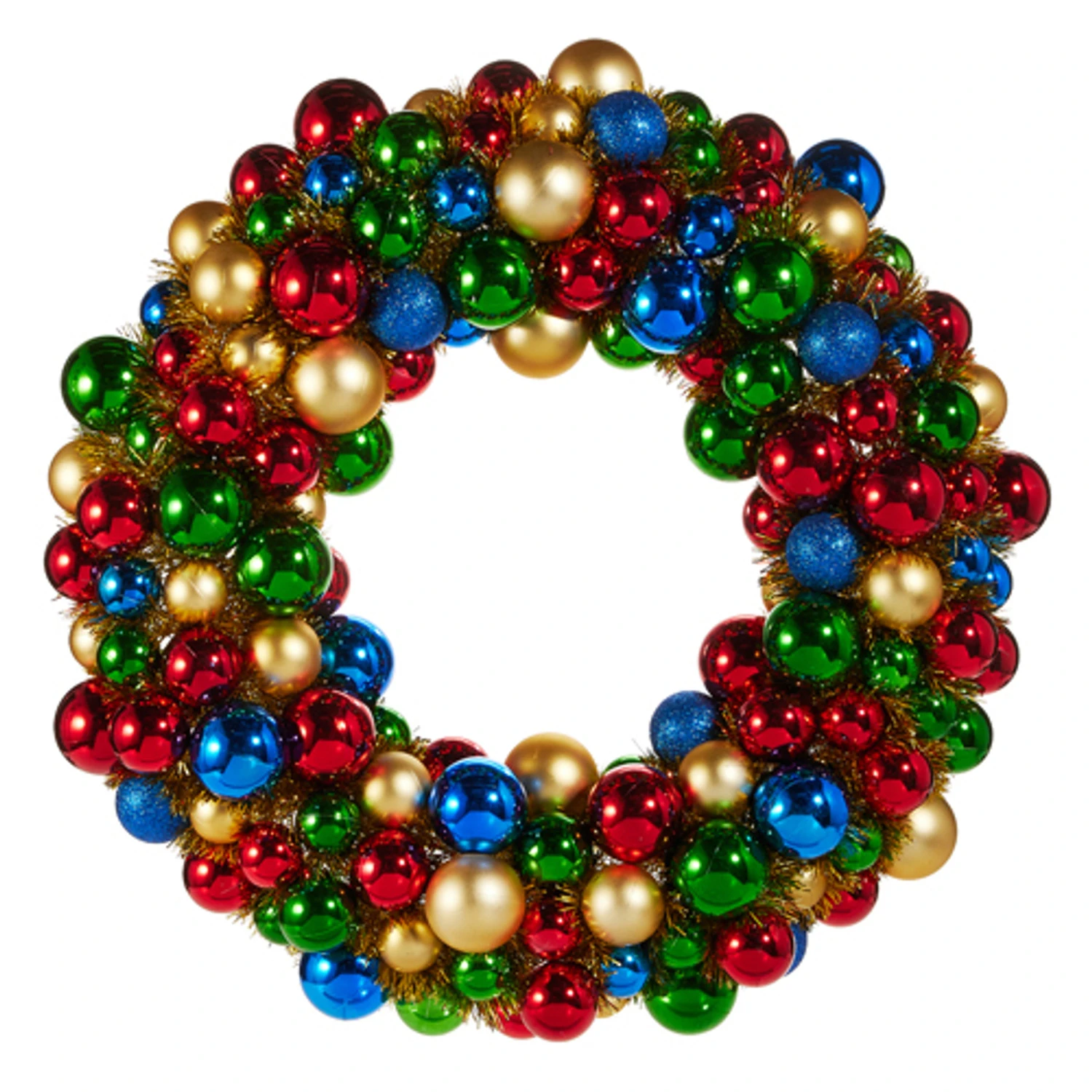 Made up of traditional colors like red, green, blue, and gold- this wreath is sure to turn heads! Sparkling gold tinsel is between each ornament and it is sure to give vintage vibes hanging above your mantle or on your front door! Made by Raz Imports. Made of plastic. Dimensions: 24″. Item #: W4516429Â