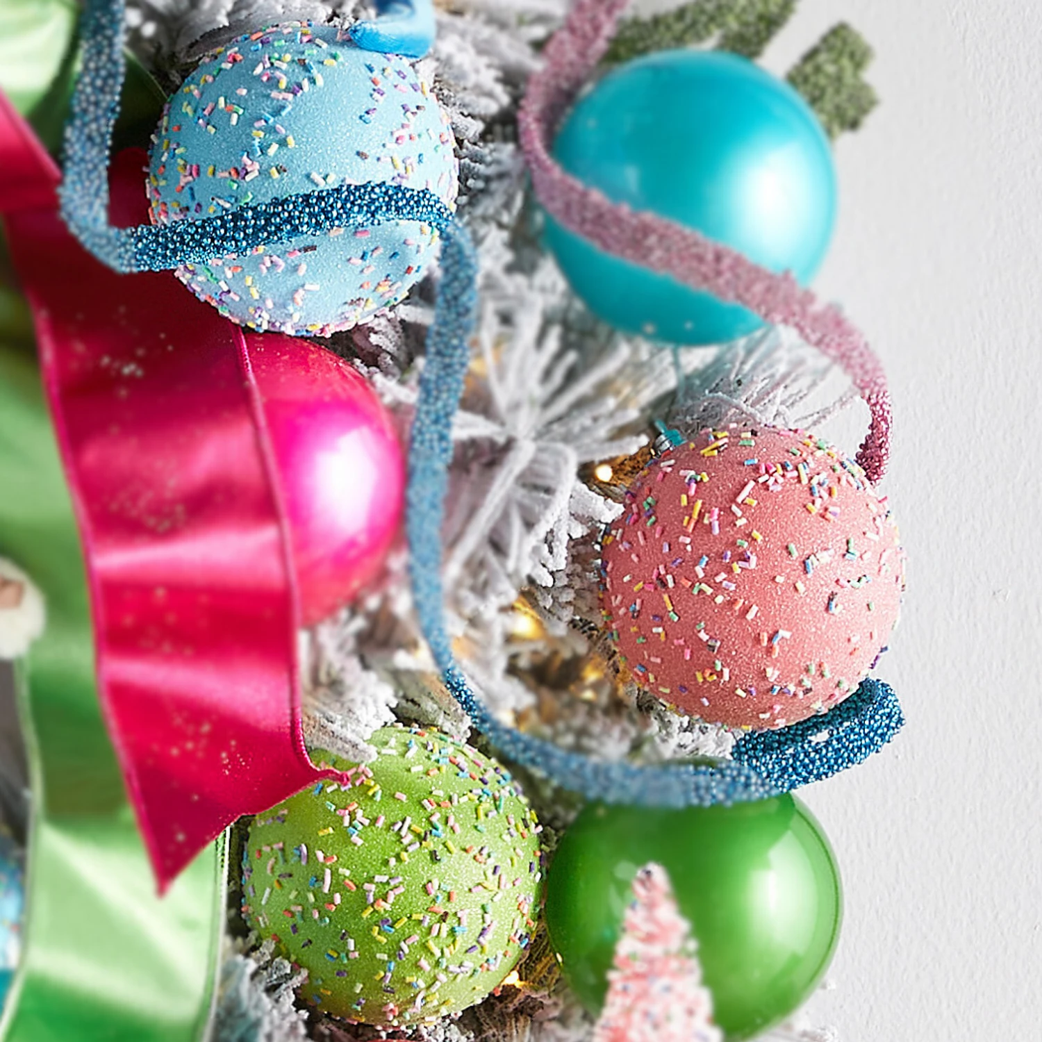 Add a dash of sweetness to your Christmas décor with this charming set of three ornaments! Each ball—one pink, one blue, and one green—is covered in colorful rainbow sprinkles for a festive candy-coated look. Perfect for decorating a kitchen-themed tree, a gingerbread display, or any whimsical holiday setting! Sold as a set of 3. Made by Raz Imports. Made of plastic. Dimensions: 4″. Item #: 4514868