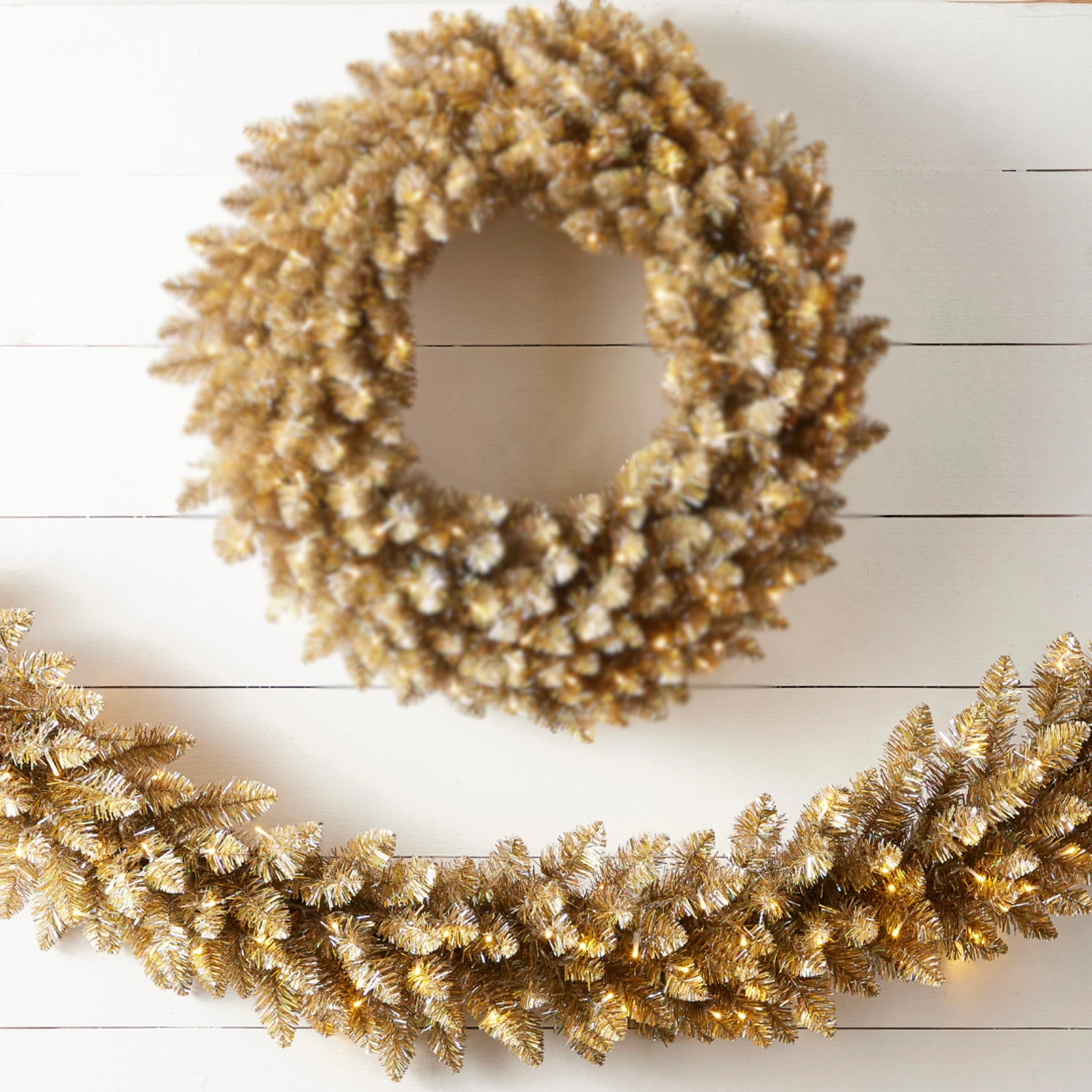 - Add sparkle and festive flair with this 6′ gold and silver tinsel lighted Christmas garland. Shimmering gold tinsel branches are wrapped in warm LED lights, creating a bold, eye-catching display. Perfect for draping along your mantle, stair railing, or entryway, it can also be combined with ornaments, bows, or picks to create a personalized and glamorous holiday look.