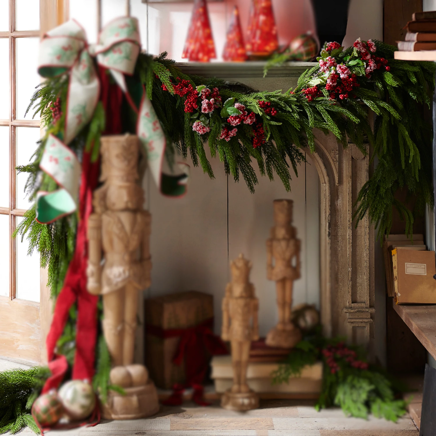 Bring natural holiday charm into your home with this 6′ green hanging real-feel Christmas garland. Made from lush, realistic looking cedar branches, it drapes beautifully across your mantle, staircase, or doorway. Use it as is for a classic look, or add picks, sprays, or ornaments to create a personalized festive display. Its full, draping design ensures a natural, elegant look that enhances any holiday décor. Made by Raz Imports. Made of plastic. Dimensions: 6′ long. Item #: G4509645