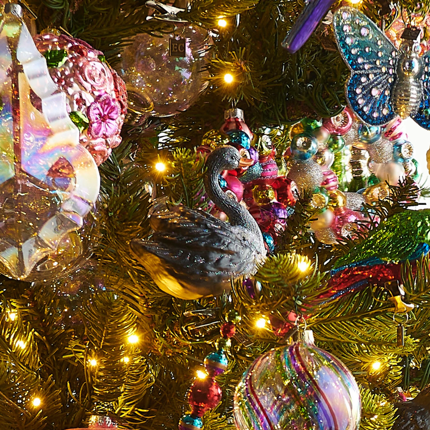 From the Eric Cortina collection, this glass black swan ornament is as striking as it is unique. Its grey-black body is dusted with iridescent glitter and sequins, and a bright orange bill adds a bold accent. The clip-on design makes it easy to add to your Christmas tree, garlands, or wreaths. With exquisite craftsmanship and vintage-inspired charm, this collectible piece is a keepsake you’ll treasure for years. Made by Raz Imports. Made of glass, resin, and metal. Dimensions: 4″ L X 2″ W X 4.5″ H. Item #: 4553125