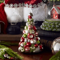 This little tree is made up of brightly colored red and green ornaments with silver balls mixed in! Eric Cortina is known for making the most gorgeous, unique Christmas ornaments for the holidays! Made by Raz Imports. Made of glass. Dimensions: 3.5″ D X 5.5″ H. Item #: 4353167