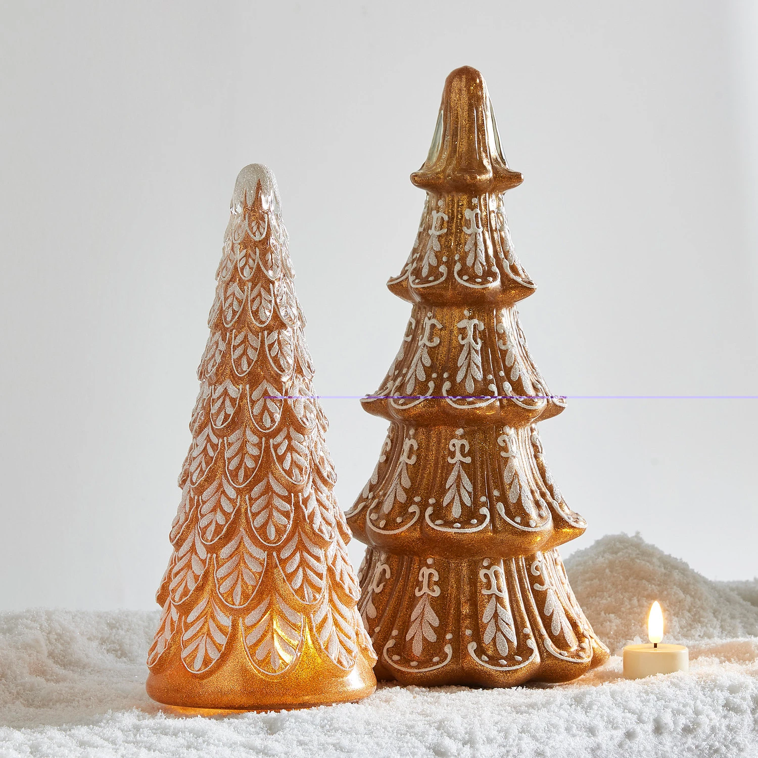 Add a sweet sparkle to your holiday decor with this set of 2 ornate glass gingerbread trees from Raz Imports. Crafted from glass with detailed tree branch texture, each piece is finished in rich caramel-colored glitter and accented with delicate white icing-style designs that mimic classic gingerbread cookies. Perfect for tabletops, mantels, or tiered trays, these trees bring a cozy, confection-inspired charm to your Christmas display. A must-have for gingerbread, candyland, or whimsical holiday themes! Sold as a set of 2. Made by Raz Imports. Made of glass. Dimensions: 7″D X 14.5″H; 5″D X 11.75″H. Item #: 4512515