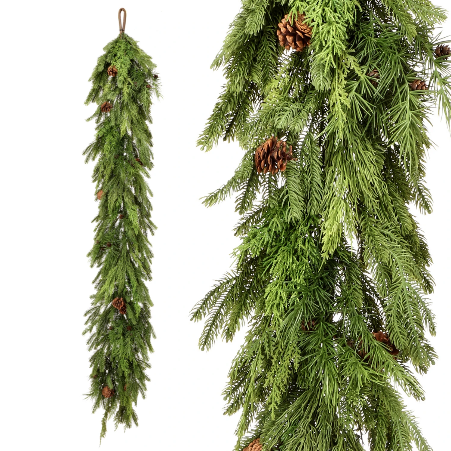 Drape this gorgeous real feel garland along your mantle or stair railing this holiday season! It has the feeling of fresh greenery and is dotted with small pine cones! Made by Regency International. Dimensions: 6′ x 12″. Item #: MTX73279Â